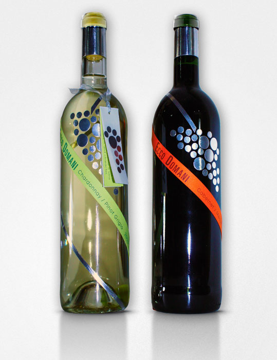 Wine bottles with metallic labels.